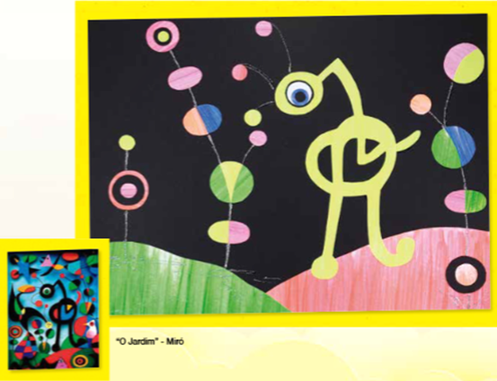 Entre as sugestões de obras, estão as de Maurício Loureiro, com "Peixe Margarida", que mistura formas geométricas e cores vibrantes; a obra "O Jardim", de Joan Miró, com suas formas orgânicas e lúdicas; a "Paisagem (1925)", de Tarsila do Amaral, que apresenta o modernismo com cores vivas e formas simplificadas; e "Flores em Vétheuil", de Claude Monet, onde a técnica impressionista ganha vida através de pinceladas rápidas e uma mistura encantadora de cores.