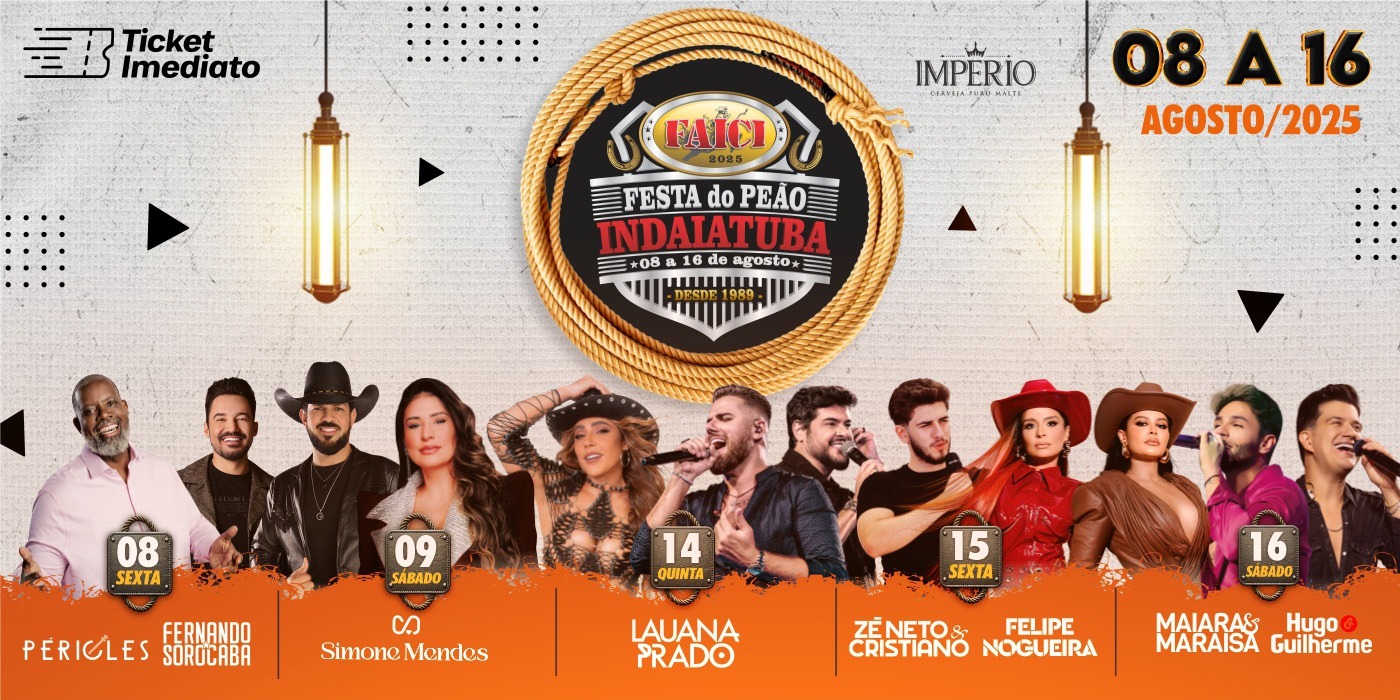 Cinco dias de festa. Oito grandes shows. A edição 2025 da FAICI - Festa do Peão de Indaiatuba já tem data para acontecer: de 08 a 16 de agosto. Entre os shows confirmados estão Péricles, Fernando & Sorocaba, Simone Mendes, Lauana Prado, Zé Neto & Cristiano, Felipe Nogueira, Maiara & Maraísa e Hugo & Guilherme. A venda de ingressos para Pista e camarotes Super Premium e Infinity Prime, além do Passaporte FAICI, começa nesta quarta-feira (19), através da Ticket Imediato.
