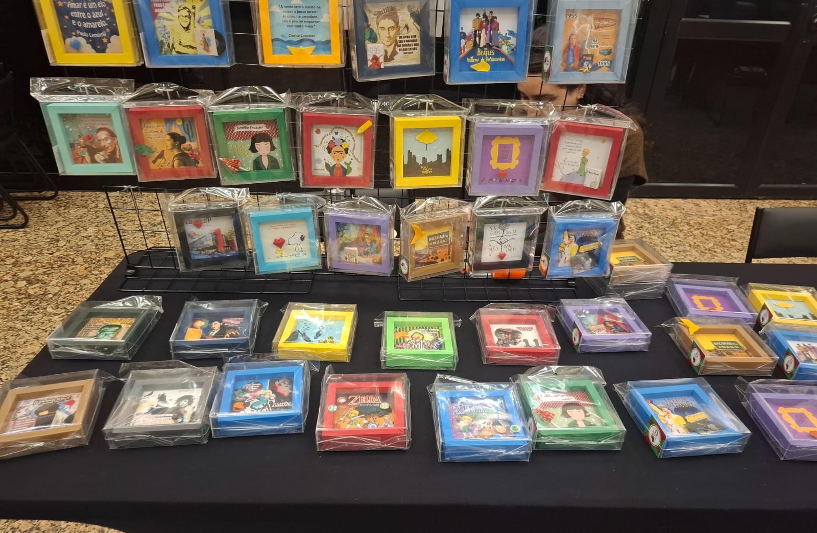 Entre os quadros feitos tem por exemplo do Bacurau, Dracula, Frankenstein, Beetlejuice, Stranger Things, Zelda Harry Potter, Friends, The Beatles, Freddie Mercury, Frida Kahlo, etc.